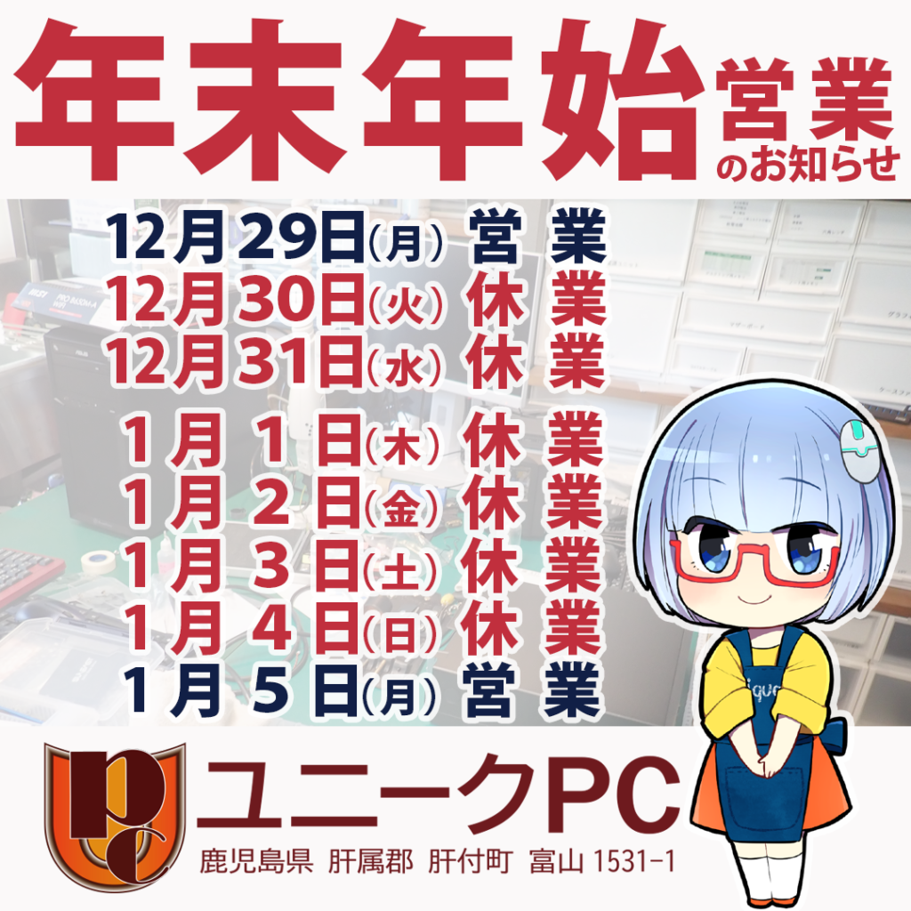 ユニークPCの年内営業は12月29日まで、年始の営業開始は1月5日からとさせていただきます。